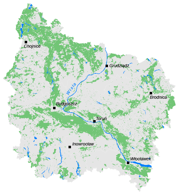 kolor szary – zasięg terytorialnego działania kolor zielony – lasy kolor niebieski – wody