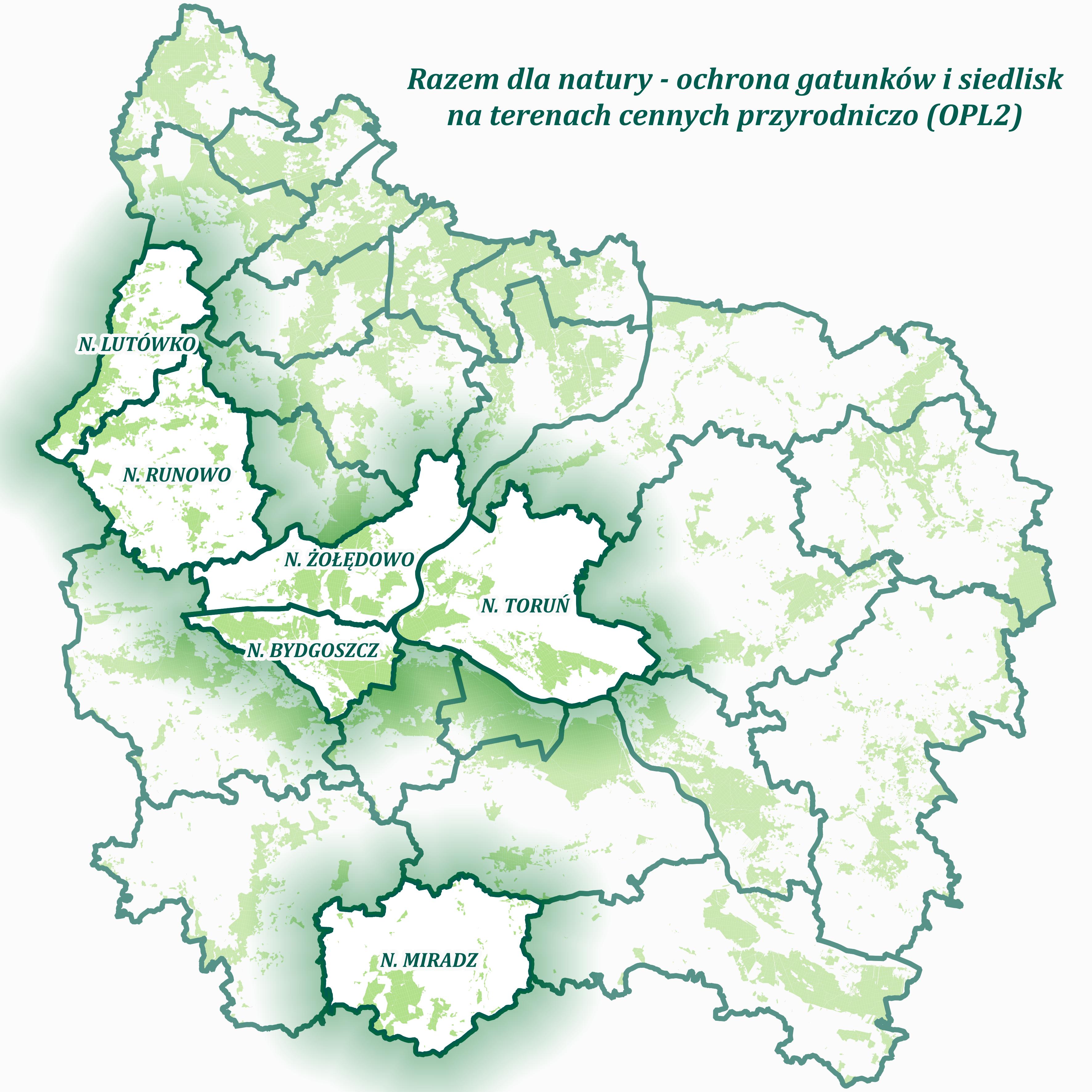 Zasięg realizacji projektu pn. "Razem dla natury – ochrona gatunków i siedlisk na terenach cennych przyrodniczo"